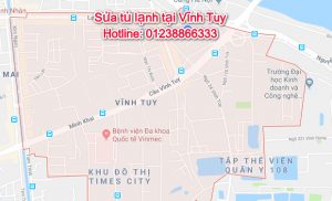 Đội ngũ thợ Sửa tủ lạnh tại Vĩnh Tuy hoạt động hàng ngày trên các cung đường và tuyến phố sau : 8-3, Bà Triệu, Bạch Đằng, Bạch Mai, Bùi Ngọc Dương, Bùi Thị Xuân, Cảm Hội, Cao Đạt, Chùa Vua, Đại Cồ Việt, Đại La, Đỗ Hành, Đỗ Ngọc Du, Đoàn Trần Nghiệp, Đội Cung, Đống Mác, Đồng Nhân, Dương Văn Bé, Giải Phóng, Hàn Thuyên, Hàng Chuối, Hồ Xuân Hương, Hoa Lư, Hòa Mã, Hoàng Mai, Hồng Mai, Huế, Hương Viên, Kim Ngưu, Lạc Nghiệp, Lạc Trung, Lãng Yên, Lê Đại Hành, Lê Duẩn, Lê Gia Đỉnh, Lê Ngọc Hân, Lê Quý Đôn, Lê Thanh Nghị, Lê Văn Hưu, Lò Đúc, Lương Yên, Mạc Thị Bưởi, Mai Hắc Đế, Minh Khai, Ngô Thì Nhậm, Nguyễn An Ninh, Nguyễn Bỉnh Khiêm, Nguyễn Cao, Nguyễn Công Trứ, Nguyễn Đình Chiểu, Nguyễn Du, Nguyễn Hiền, Nguyễn Huy Tự, Nguyễn Khoái…